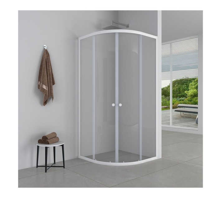 The curved double-sliding door design facilitates a professional entry and exit, allowing for a seamless fit within tiled corner alcoves.