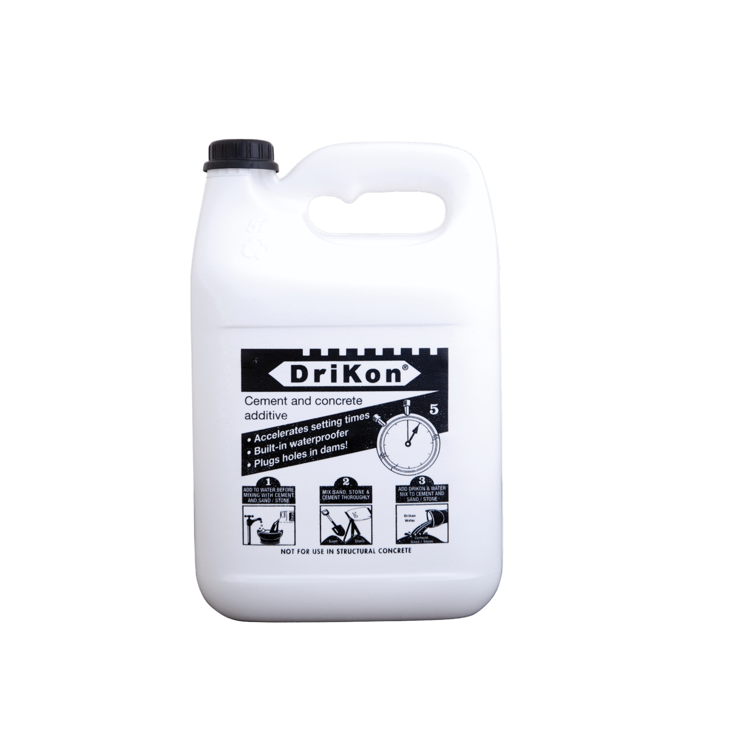 Moreover, incorporating Drikon into your mix is simple and efficient. You dilute the required amount of Drikon with water first, and then introduce it to your sand, stone, and cement blend. Ultimately, this economical 5-litre container offers reliable, decades-proven performance, combining speed and superior water resistance for professional-grade concrete work.