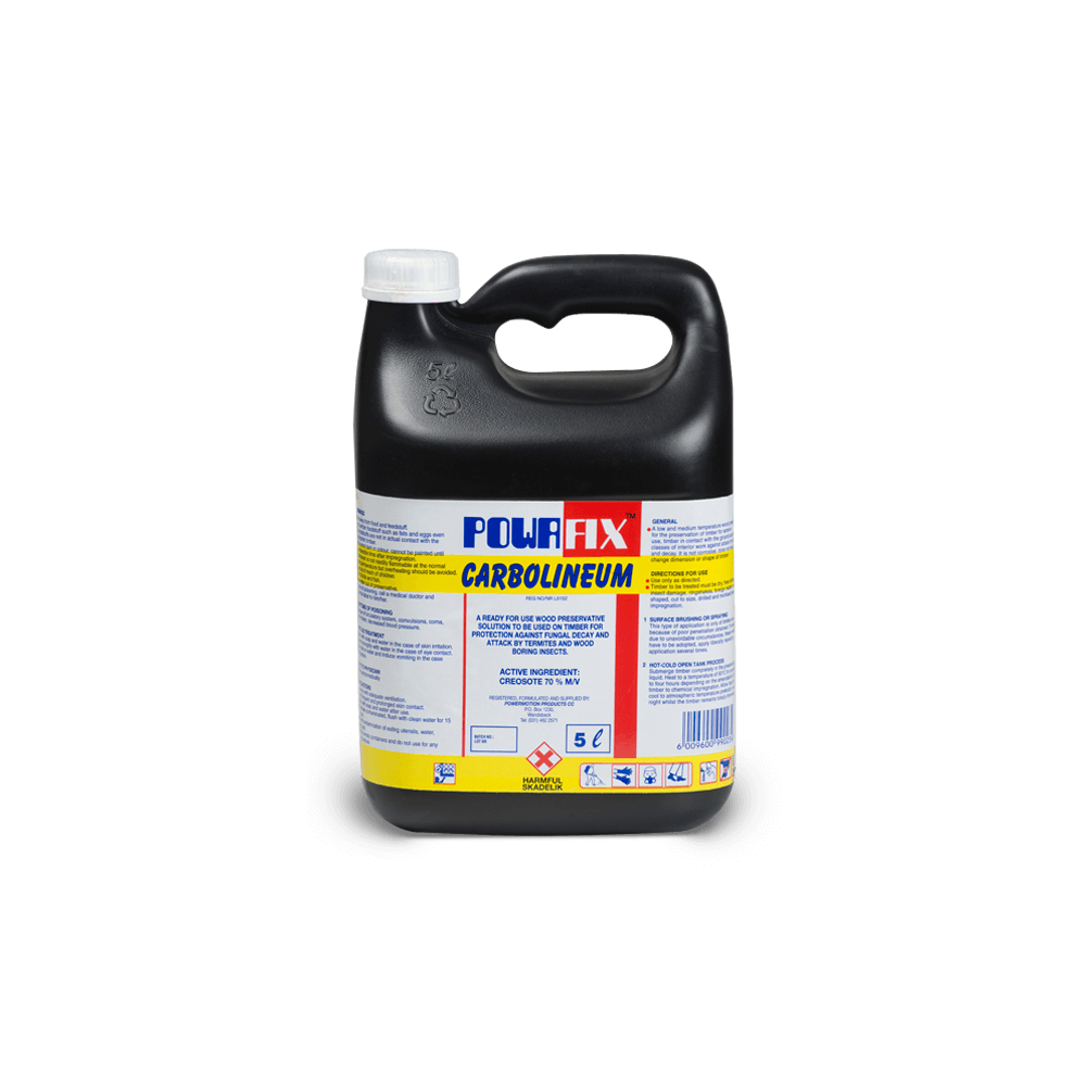 Powafix Carbolineum 5L is a powerful, ready-to-use wood preservative designed to protect exterior timber from pests and decay. Its deep-penetrating formula safeguards against wood borer, white ants, and fungal damage, extending the lifespan of wooden structures. Because it forms a strong barrier against moisture and insects, it is ideal for long-term outdoor protection.
